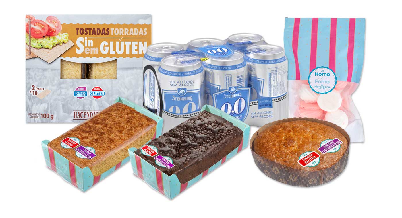 Tostas Torradas Sem Glúten, Bolo Sem Glúten e Sem Lactose, Bolo de chocolate Sem Glúten e Sem Lactose, Bolo de Cenoura Sem Glúten e Sem Lactose, Cerveja Sem Glúten Steinburg 0,0% Sem Álcool, Suspiros de Merengue Sem Glúten, Gelado Menta Choco, Gelado Mini Bombom Sem Adição de Açucares, Gelado Capuccino e o Gelado Baunilha Praliné com Nozes Pecan são alguns dos produtos que, para além do selo que garante a inexistência do glúten, possuem o selo de qualidade Mercadona.